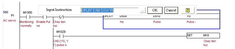Trong cửa sổ soạn thảo chương trình theo dạng Ladder, người lập trình chỉ cần gõ trực tiếp câu lệnh : DPLSY D500 D510 Y0
