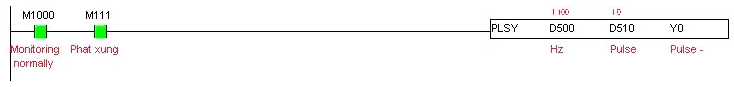 Khi M111 ON, và giá trị D500 ( 16 bít, không phải Double 32 bit ) được đặt, lệnh phát xung sẽ có tác dụng, ngõ ra Y0 sẽ có một chuỗi xung vuông đến khi số xung phát ra bằng với thanh ghi D510. Và nếu D510 = 0 thì lệnh phát xung sẽ tạo ra một chuỗi xung liên tục đến khi bit M111 được OFF . Ở đây tần số phát xung là D500 = 100Hz.